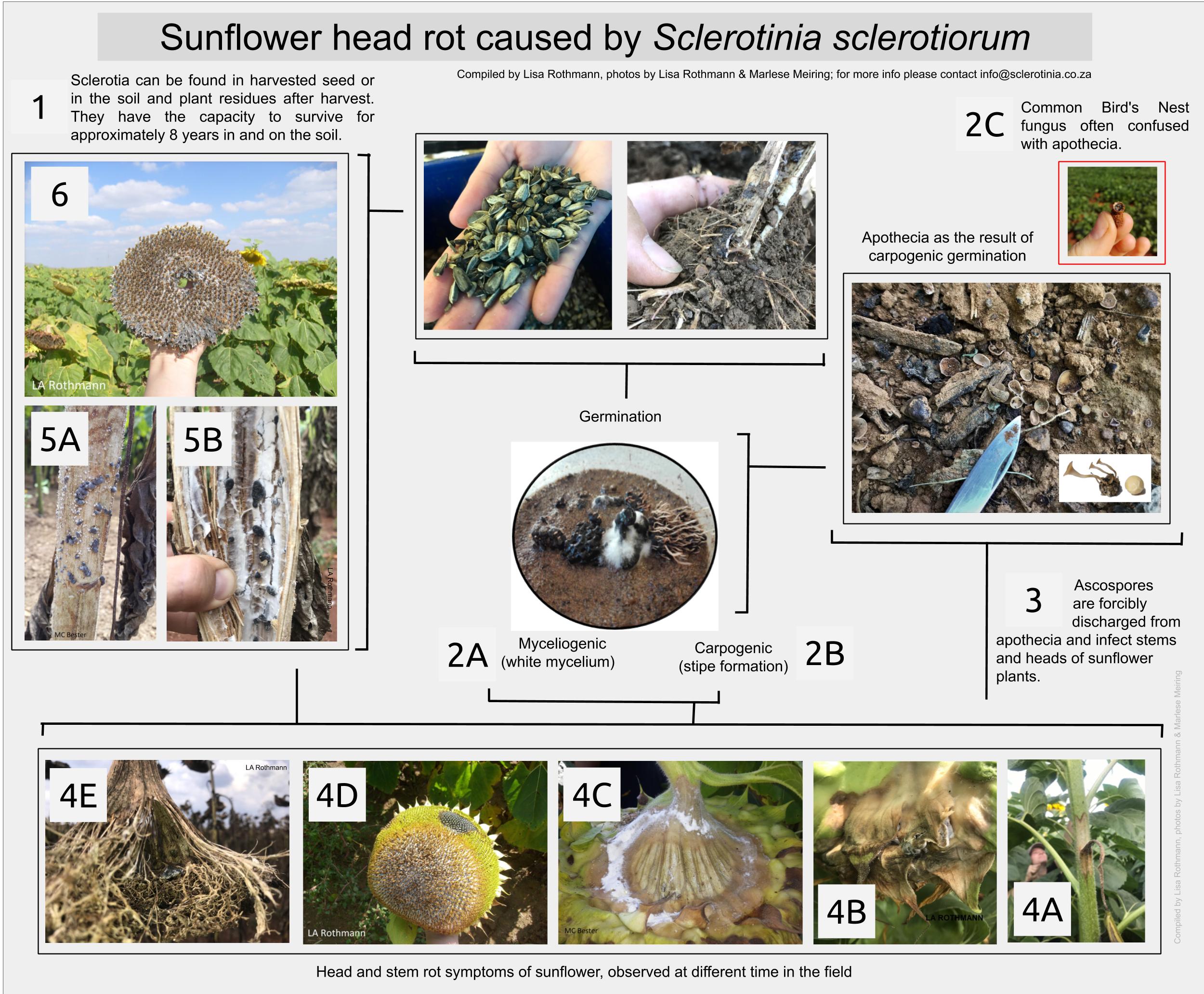 A photographic illustration of the in-field life cycle of Sclerotinia sclerotiorum, the fungal pathogen responsible for causing sunflower head and stem rot.